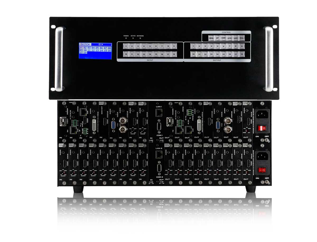 本矩阵单通道交换信号速率高达12.5Gbps,主板交换能力采用四核四链路处理技术,核 心交换能力可达速率32Gbps 。数字信号运用无压缩的传输方式,保证图像信号的高保真输 出; 独特的信号链路屏蔽设计技术保证信号的完整性; 内部核心数字开关具有超强的抗干扰 能力及长期连续工作的高稳定性; 运用先进的高级算法,保证命令的高效实时性; 可选择 CVBS/YPbPr/VGA/HDMI/DVI/SD/HD/3G-SDI/HDBaseT/Fiber等信号作为输入或输出,完成大路数 信号的配置规模,灵活的插卡式、模块化结构; 采用独特的处理方式,大大提高设备的切换 速度,实现指令之间不需等待的快速控制,实现无缝快速切换功能; 整套设计理念完美解决 视频系统中信号源过多和数模信号并存的兼容难题,并可以最大程度的节省成本,利于系统 升级、扩容及维护; 过压保护和ESD防静电技术等多重保护措施,保证设备免收外部冲击; 具备掉电状态存储保护、开机自动恢复记忆的功能; 同时本矩阵具有强大的网络传输和网络 管理能力。支持7*24小时不间断运行; 具备双网络及 RS232通讯接口备份控制,可以方便与 个人电脑、中央控制系统等各种远端控制设备配合使用。